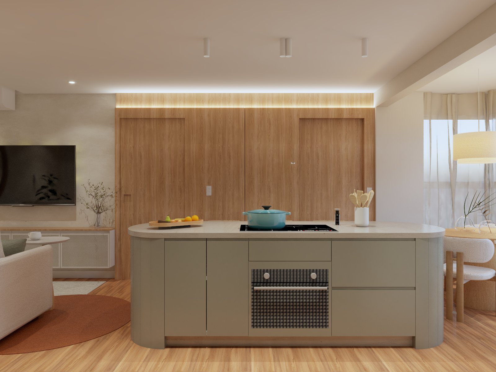 Planta baixa adaptada às demandas, com personalização baseada na rotina e necessidades da cliente, integrando o living com sacada por meio de uma grande ilha, e a transformação de uma das suítes em closet ampliando o espaço da suíte principal.