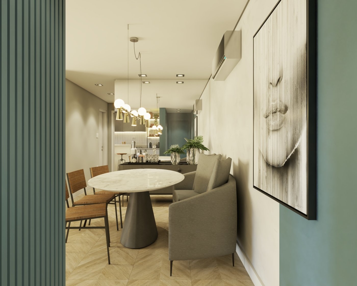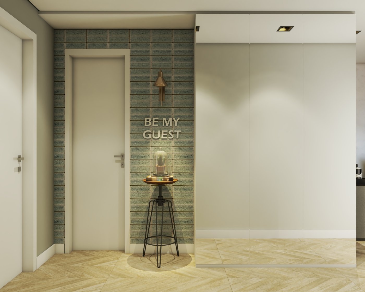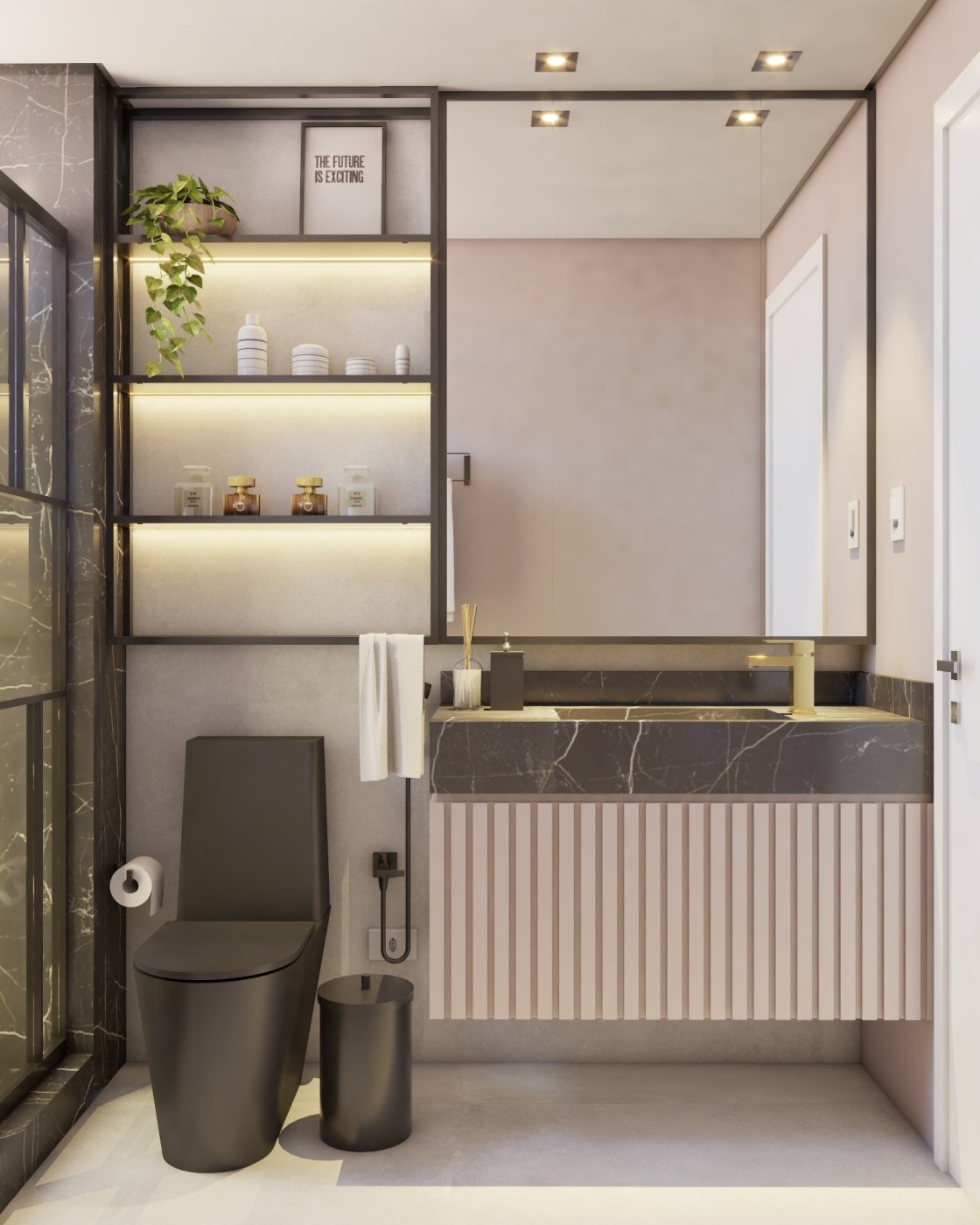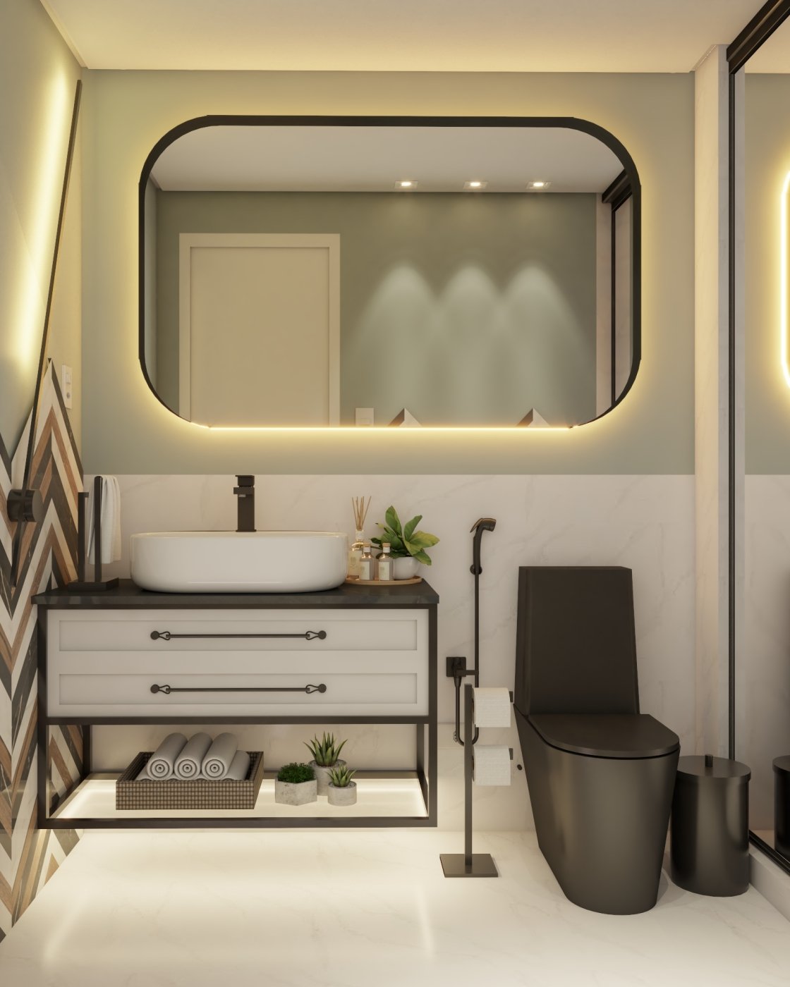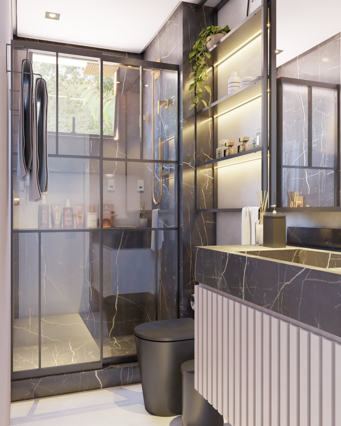 Metais diferenciados e uso de diversos acabamentos de porcelanatos, cerâmicas e tijolinhos.