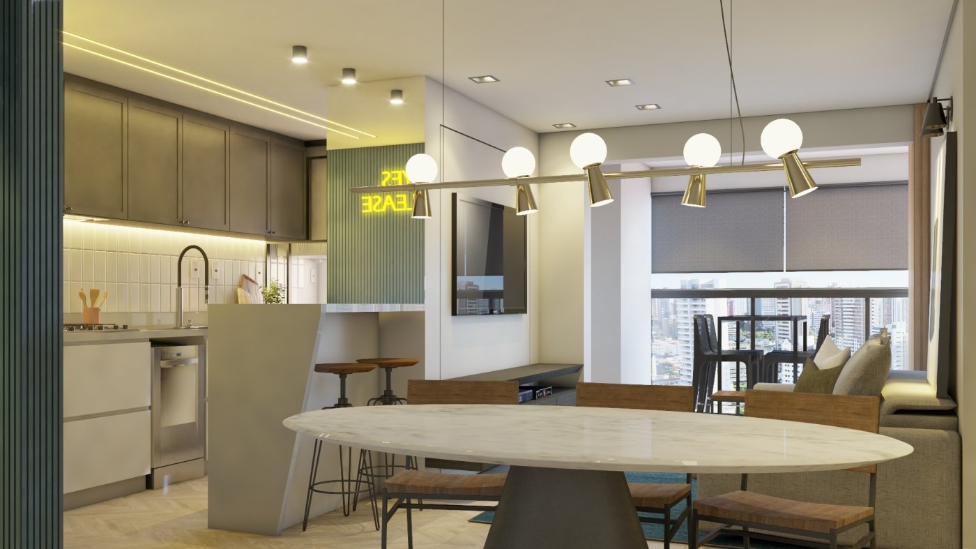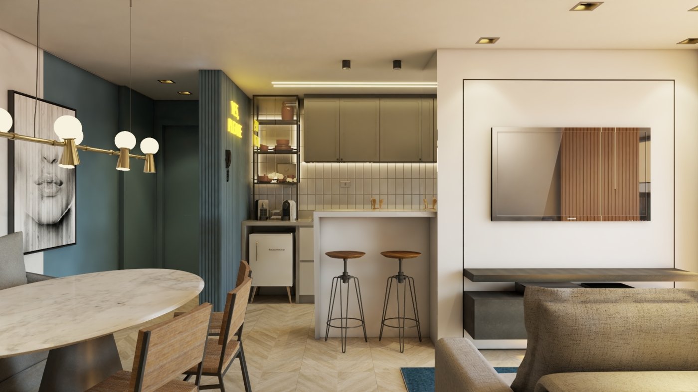 Contraste com tons mais escuros, uso de vidro canelado, pedras como acabamento para o tampo do bar e mesa de jantar + iluminação de destaque.
