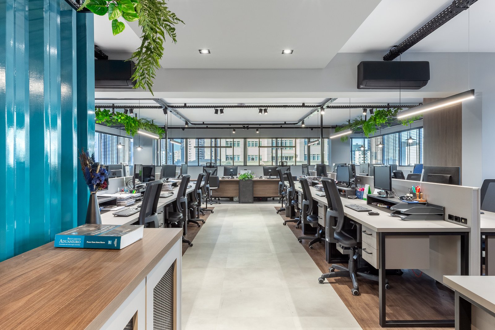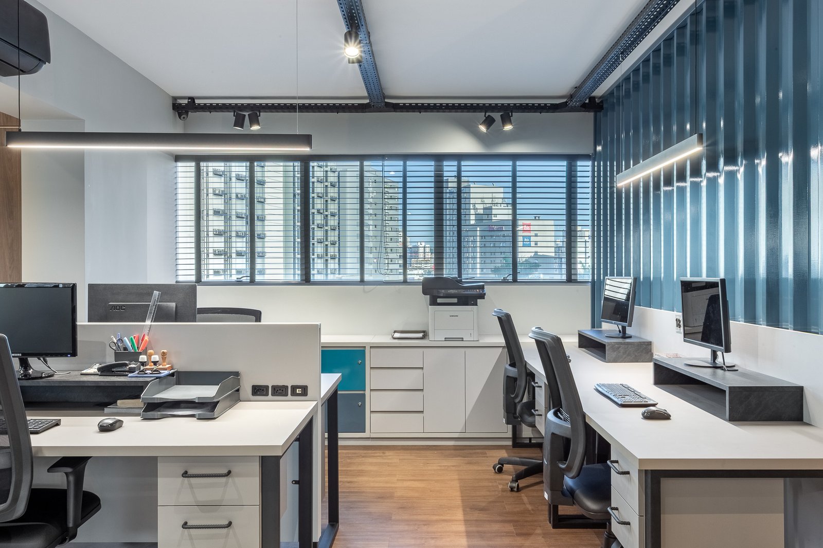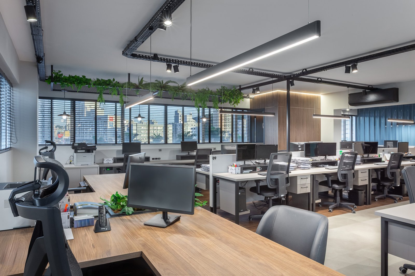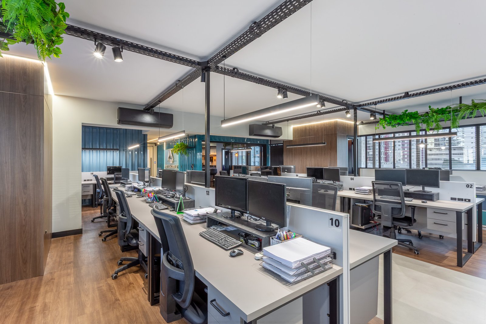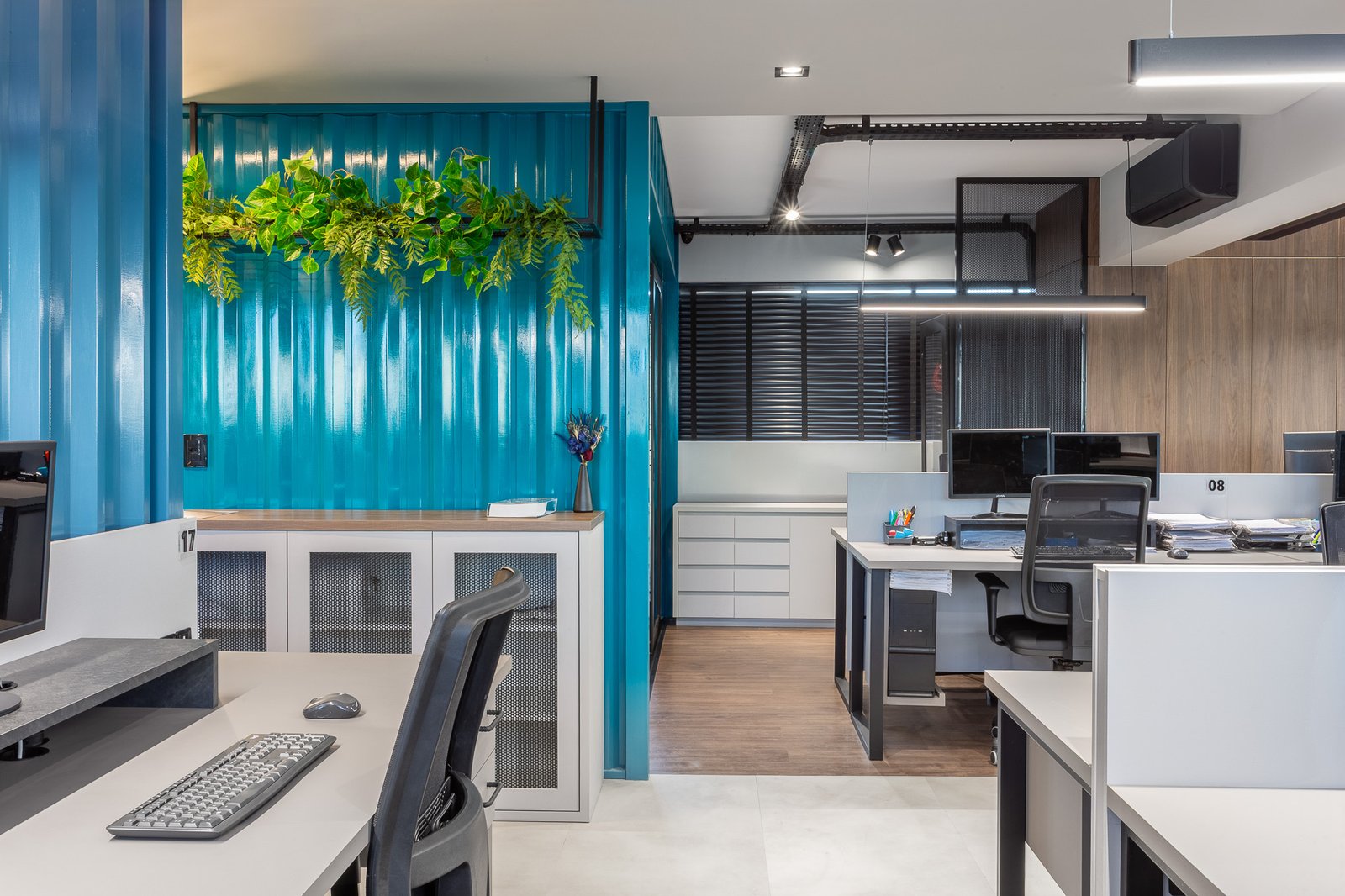 O projeto teve como foco reestruturar os espaços, trazendo mais amplitude visual, mais estações de trabalho, iluminação funcional e acolhedora, e uma nova configuração que integra sócios e equipe com mais proximidade e transparência.