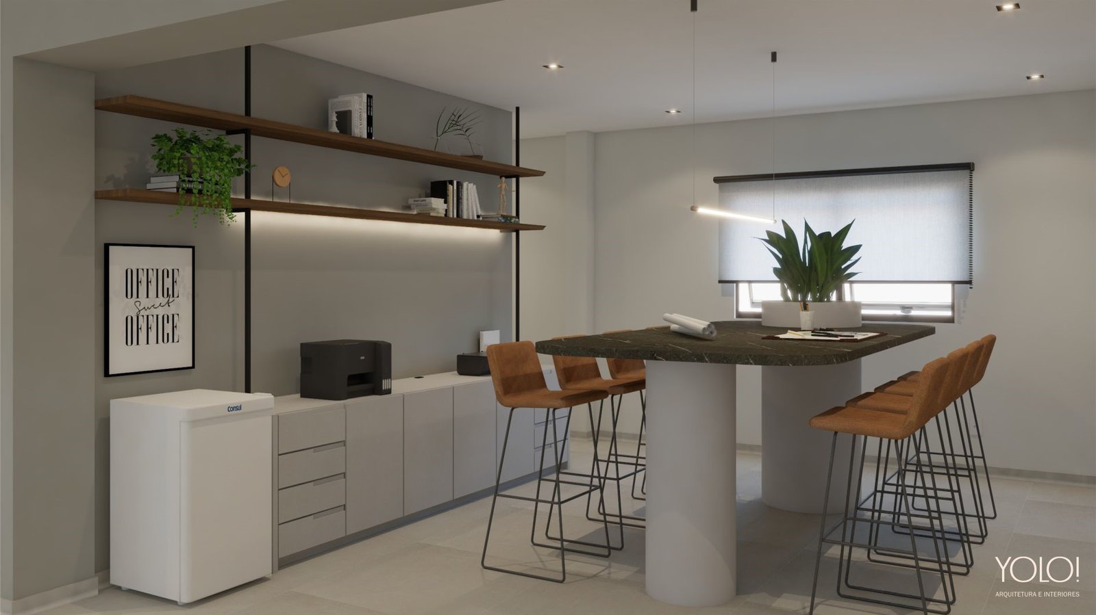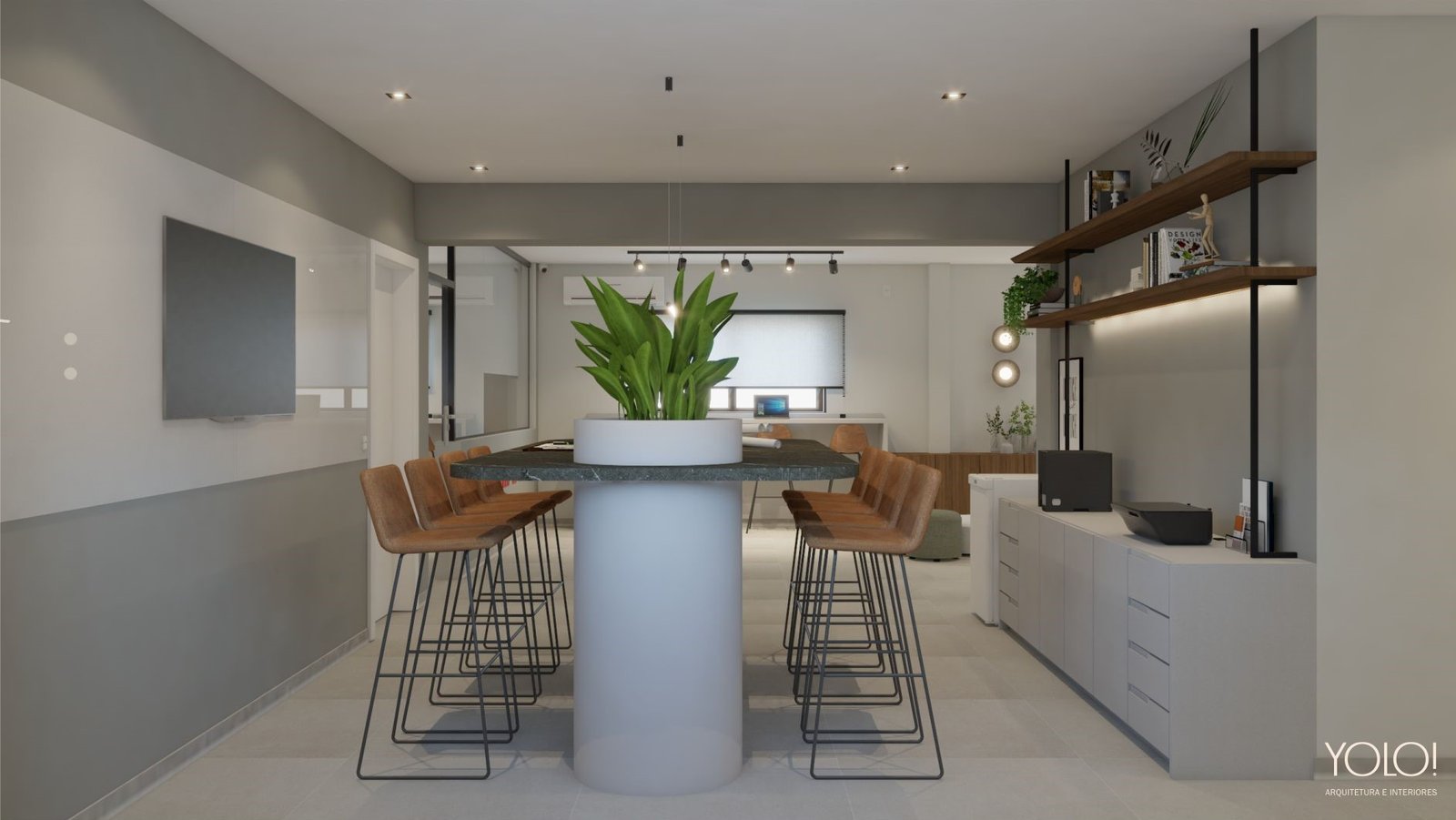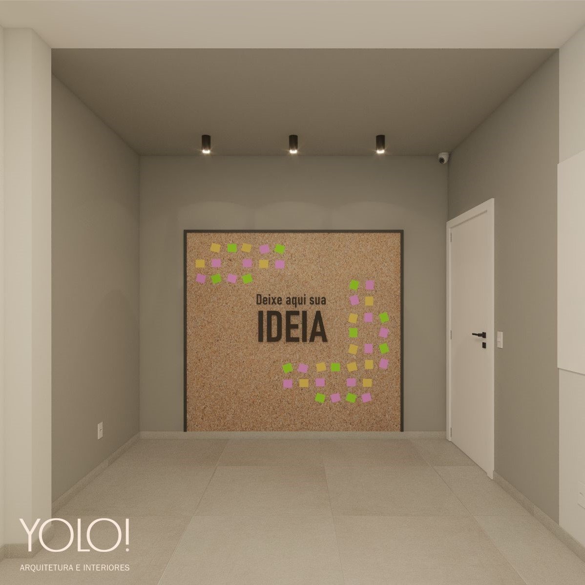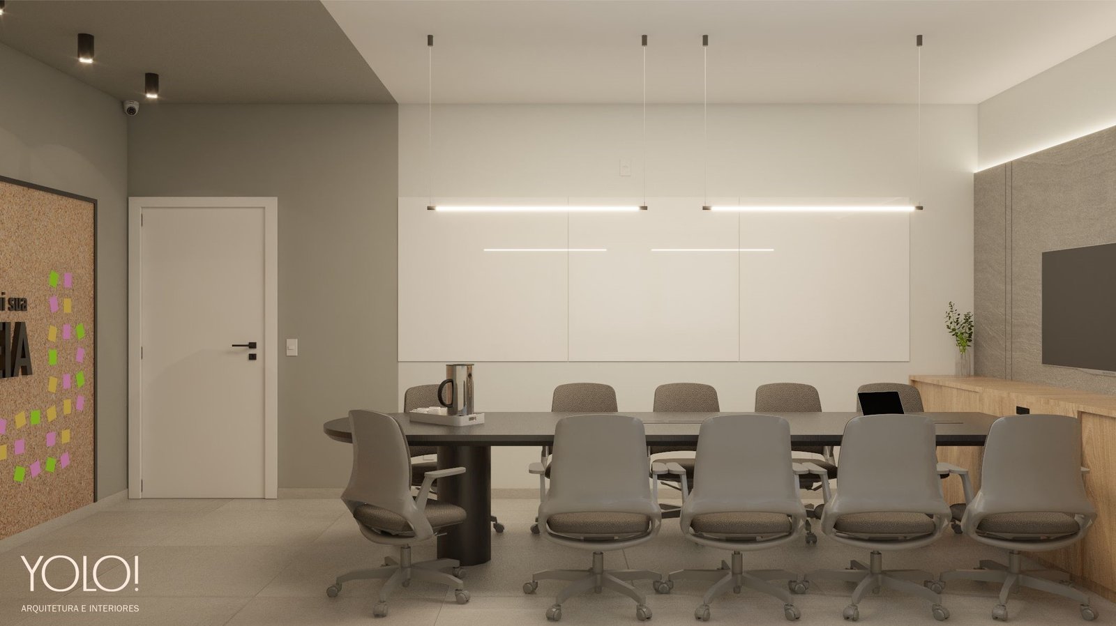 A sala de reuniões, por sua vez, equilibra formalidade e contemporaneidade, com uma iluminação cuidadosamente planejada e um quadro de ideias que incentiva a troca de insights entre os colaboradores, tornando o ambiente funcional e inspirador.