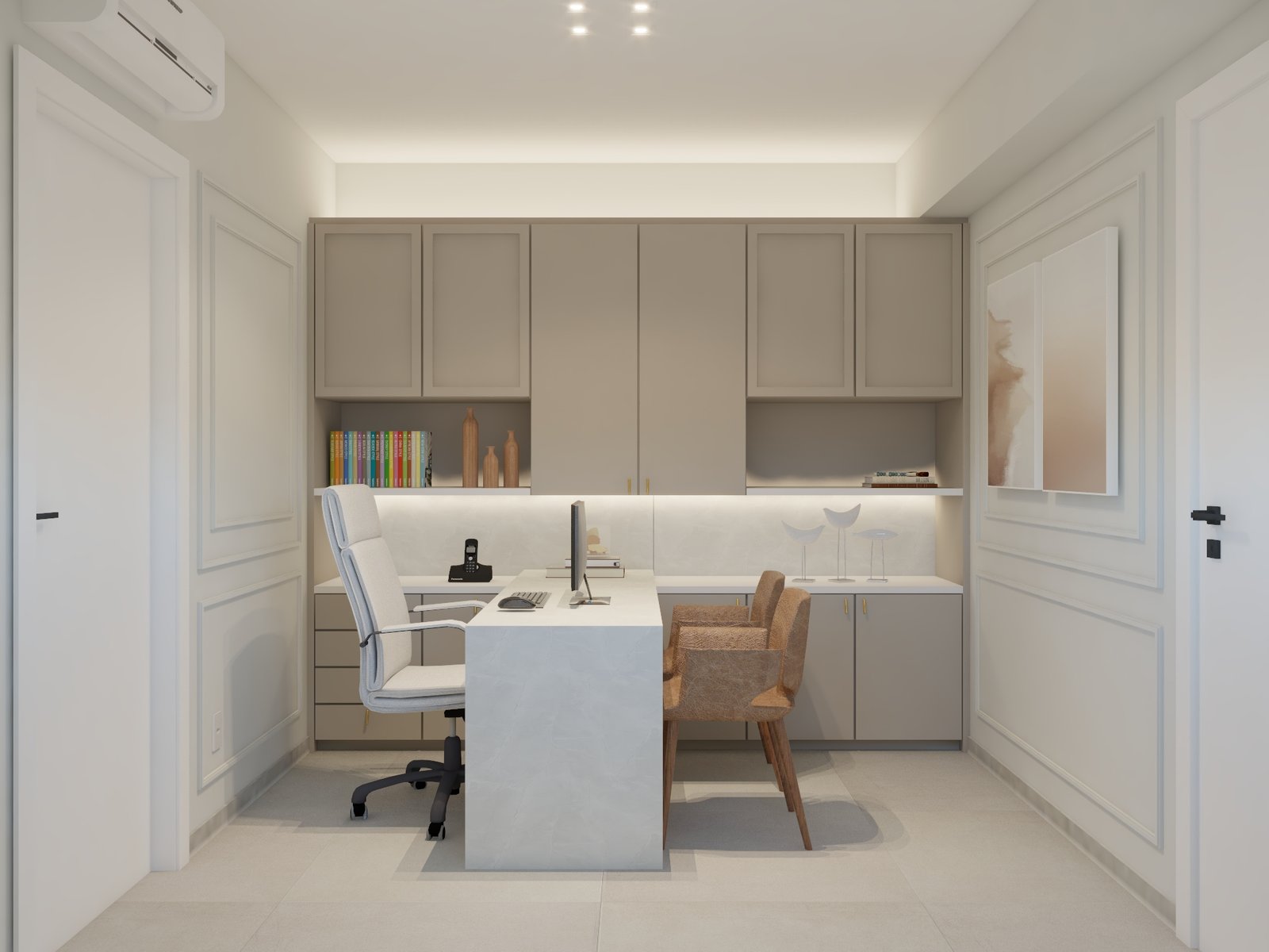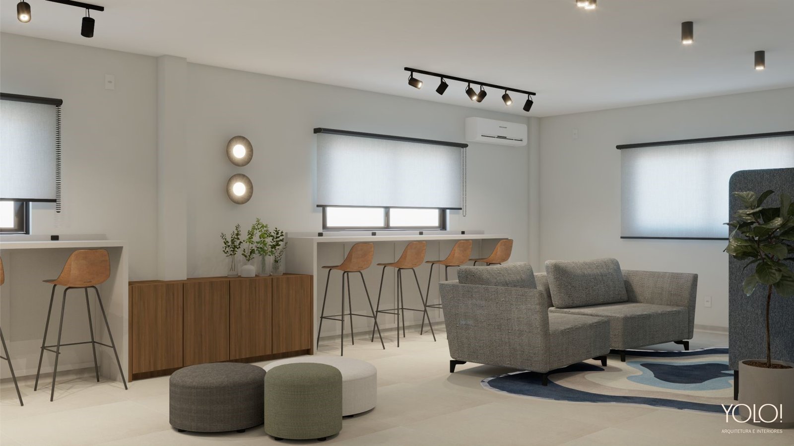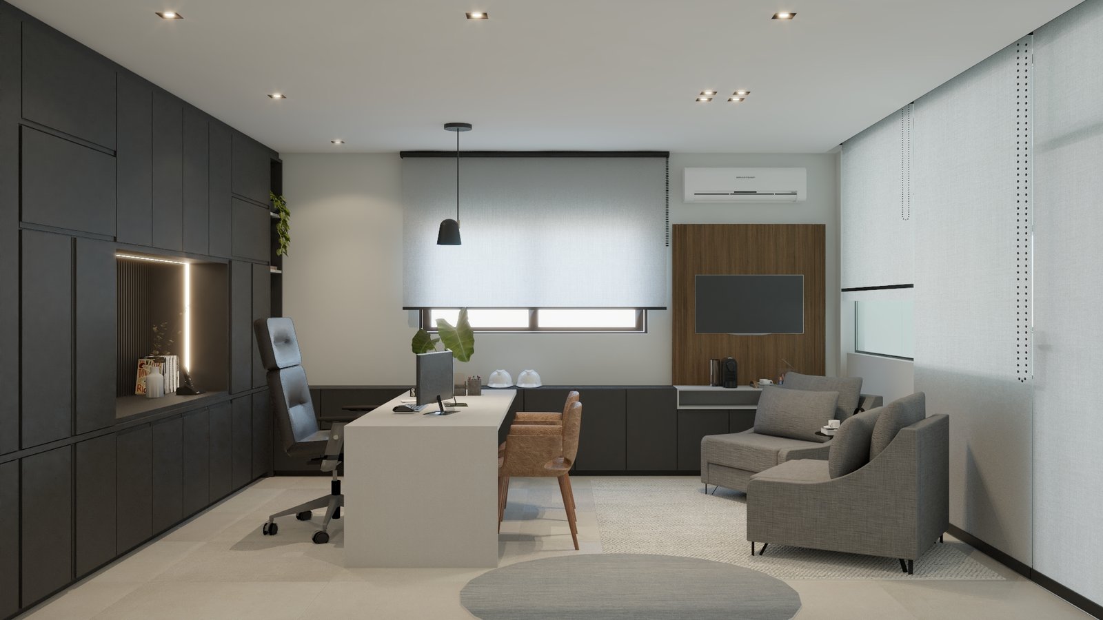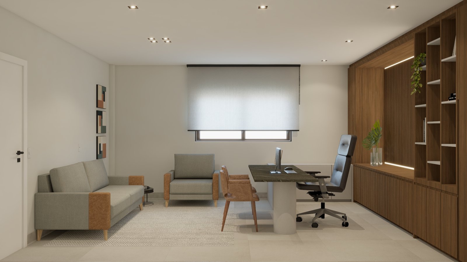 A sala de reuniões, por sua vez, equilibra formalidade e contemporaneidade, com uma iluminação cuidadosamente planejada e um quadro de ideias que incentiva a troca de insights entre os colaboradores, tornando o ambiente funcional e inspirador.