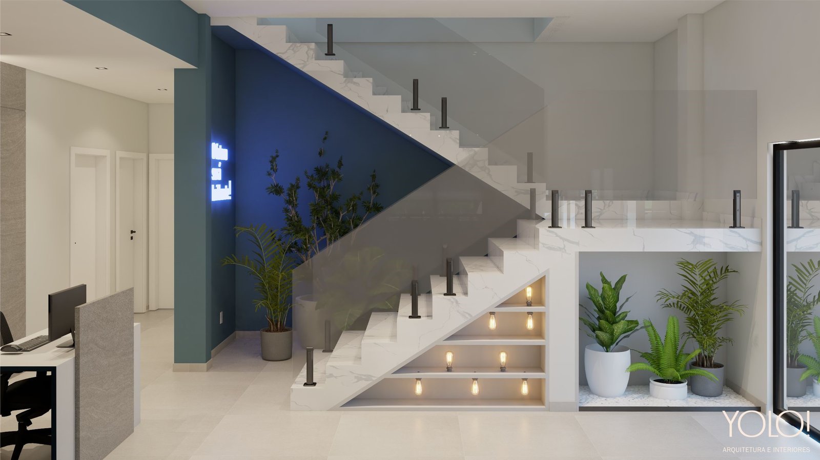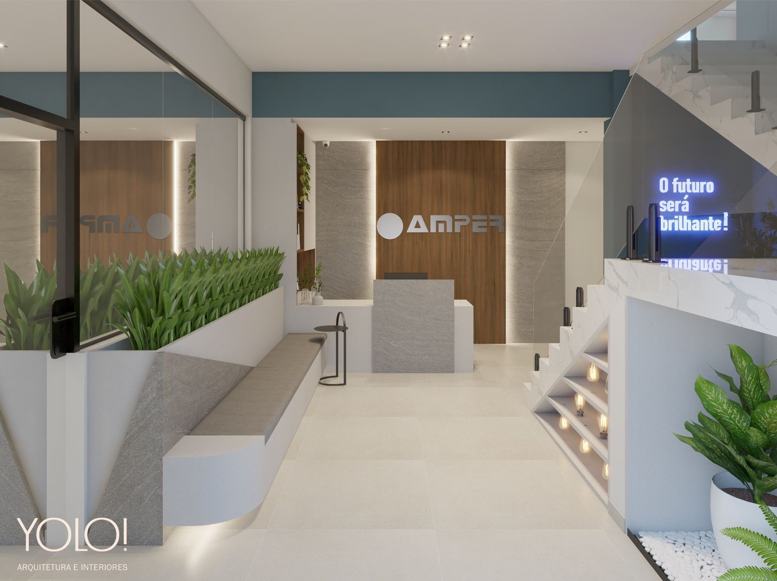 O projeto desta empresa reflete inovação e funcionalidade, destacando-se desde a recepção, que é marcada por um painel iluminado que valoriza a identidade visual da marca, além de um nicho criativo que confere elegância e personalidade ao ambiente.
