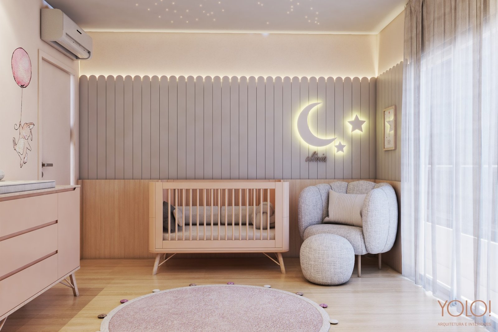 Quartinho de bebê sonhado e pensando enquanto a mini cliente ainda estava no forninho. Paleta candy colors e amadeirado neutro deixam o quarto super aconchegante e apaixonante. Elementos lúdicos como uma constelação de fibra óptica no gesso, lua e estrela em corte a laser com led, painel lambri arredondado e adesivo personalizado aquecem ainda mais o ambiente.